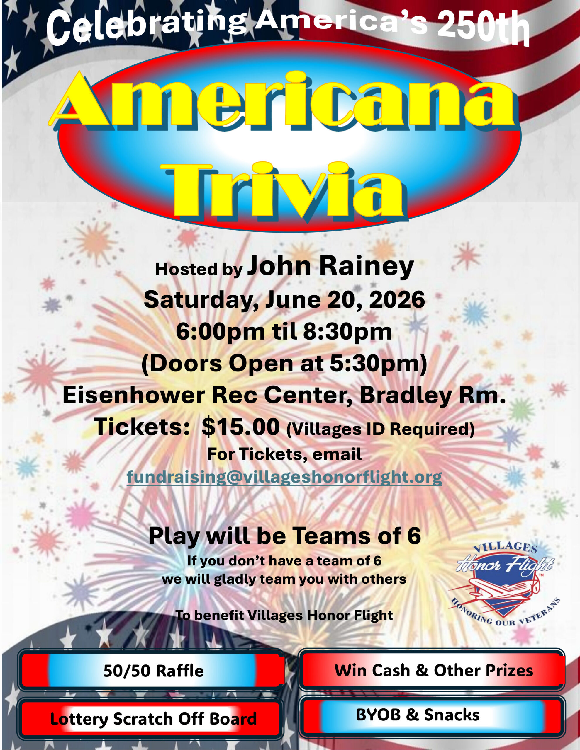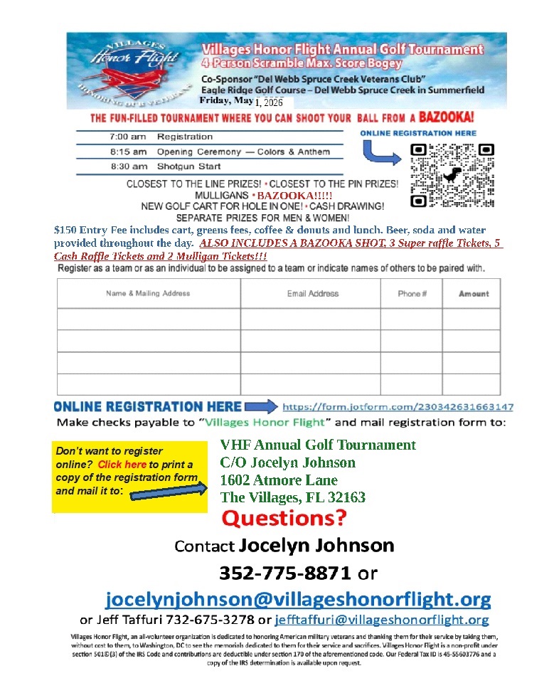 Local companies, churches, civic groups, Veteran groups, etc., are assisting the Villages Honor Flight in its quest to raise funds for our Honor Flights. These companies and organizations are donating their resources to help ensure that the Villages Honor Flight is successful. They are important sponsors. Please patronize these companies during the fundraising events and in normal day-to-day activities.